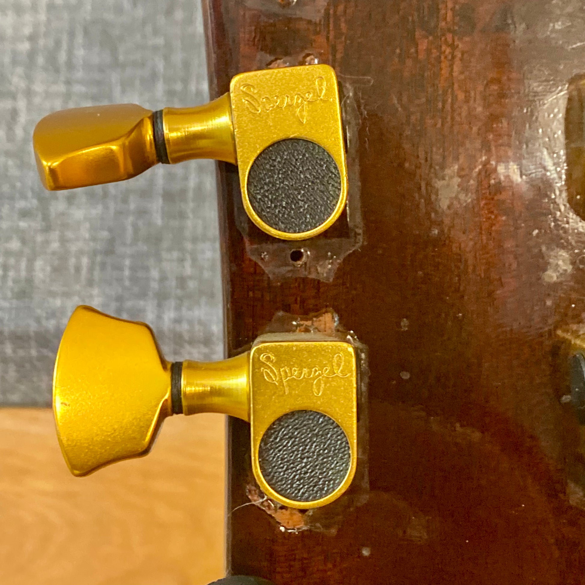 First owner guitar, very well played, minor fret wear, certainly fingerboard wear, the nitro finish has her fair share of checking. On the plus side; upgraded tuners to Sperzel Gold, action and neck relief are beautiful, saddle hasn`t been chopped down to nothing, no neck reset done, no repaired headstock breaks, original hardcase, and a passive undersaddle pickup has been added at some point. Plays great, sounds like a cannon!
