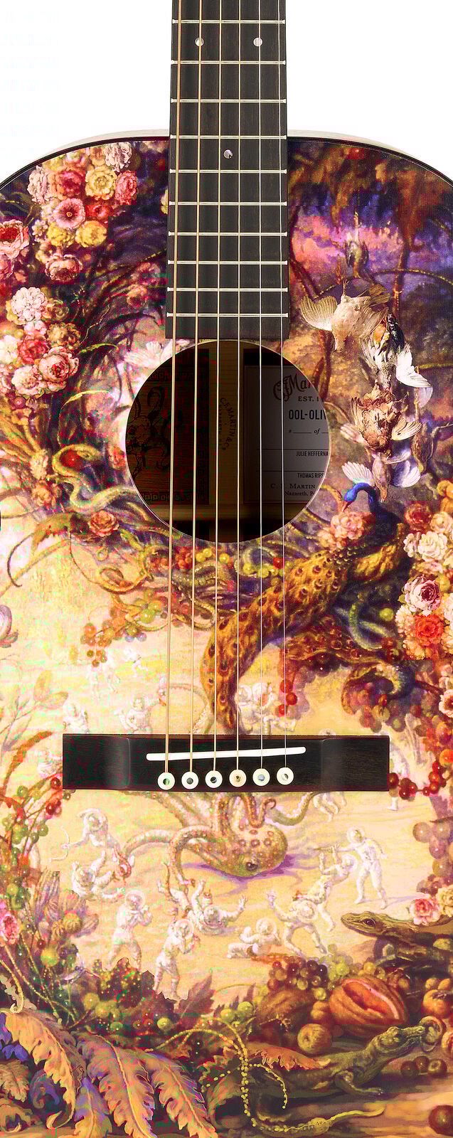 The Martin 00L Oliver is a stunning new model born from a unique collaboration between Martin Guitar and renowned artist Julie Heffernan. This limited-edition acoustic features Heffernan’s captivating oil painting Self-Portrait as Arms and the Men, beautifully reproduced on its FSC®-certified solid spruce top. Heffernan’s painting transforms the guitar into a canvas that tells a story every time you play it. Her surrealist landscape lays bare the conflict between nature and humankind's impact on the planet, and the result is something you can both showcase and play. Beyond its eye-catching artwork, the 00L Oliver, named after Heffernan's son, is crafted with premium materials and appointments. With a sloped-shoulder Grand Concert body, its solid medium-flame koa satin back and sides bridge the gap between the rich tones of rosewood and the warm, resonant qualities of mahogany. Its FSC-certified satin spruce top also delivers balanced projection while underscoring Martin's commitment to sustainability. Complete with a modified low oval mahogany neck, this guitar is a breeze to play in any style. With only 104 examples available, the 00L Oliver is a harmonious blend of art and music, inspired by Heffernan’s visionary artwork and Martin’s legacy of excellence. Whether you're a collector, musician, or lover of fine art, this guitar promises to inspire creativity and unleash your inner artist.