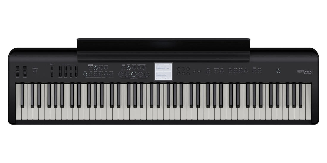 Portable digital piano with SuperNATURAL Piano and ZEN-Core sound engines, 88-note hammer-action keyboard, professional auto-accompaniment, mic input with vocal harmony effects, Bluetooth, and expansion support via Roland Cloud.The FP-E50 brings you a premium digital piano experience - and so much more. This fun portable instrument is filled with Roland's top technologies, providing a complete creative hub for learning, performing, and writing music.