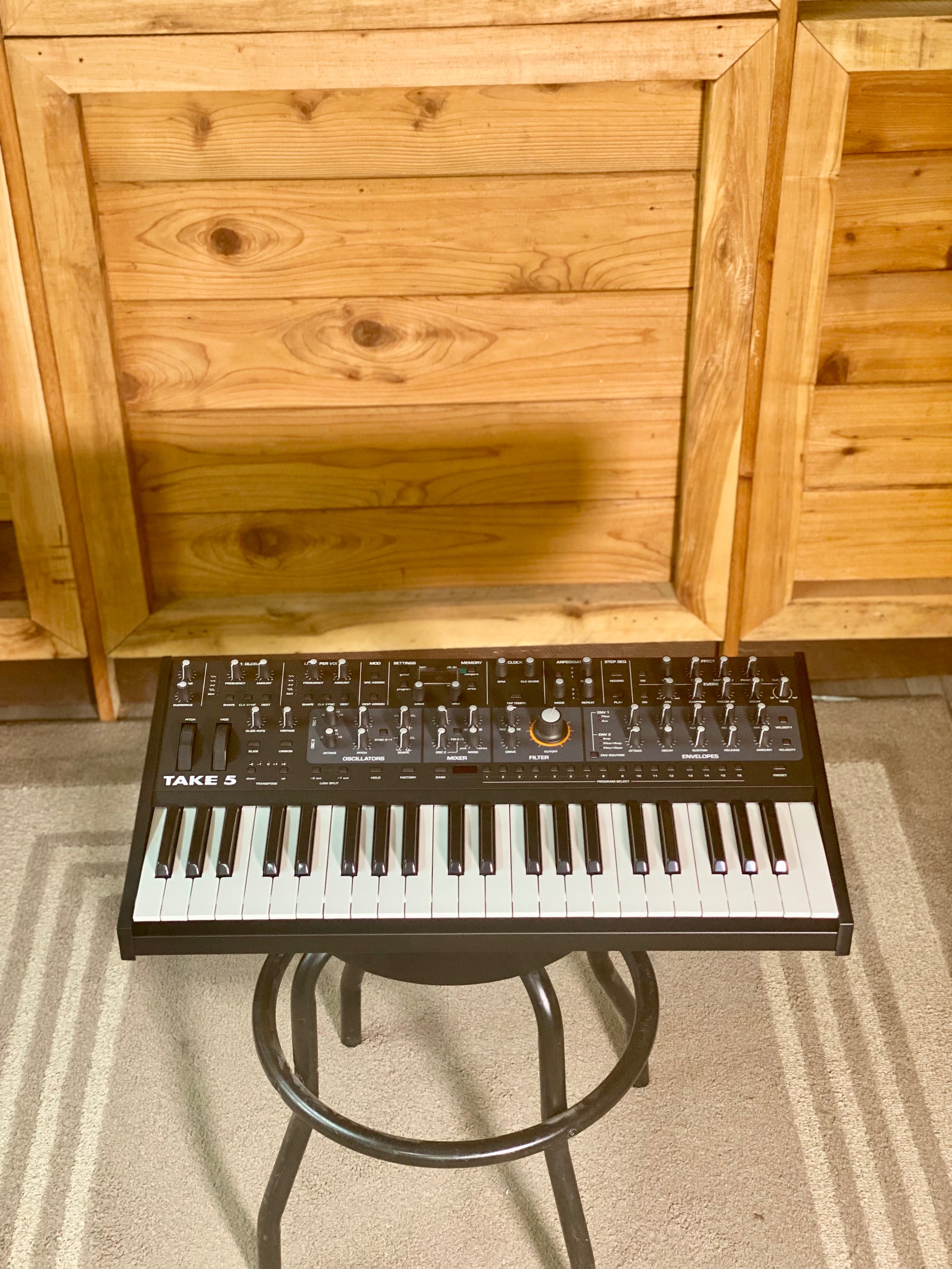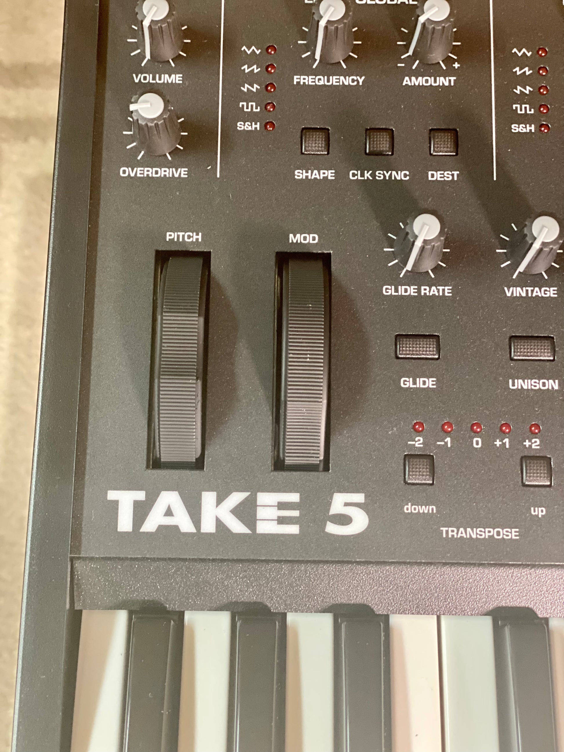 A full-featured subtractive synthesizer, the Take 5 sports two VCOs and a sub oscillator per voice, a classic 4-pole, resonant analog filter from the Prophet-5 Rev 4 design, 44 full-size keys, and a premium Fatar keybed. Its clever key-split feature gives players access to a wider playable range than many other compact synths by enabling players to divide the 3.5 octave keyboard into two separate performance zones. Dual Digital effects and a dedicated overdrive, continuously variable wave shaping, and front-panel access to analog FM ensure the Take 5 can cover a wide range of sonic territory, from vintage to modern.