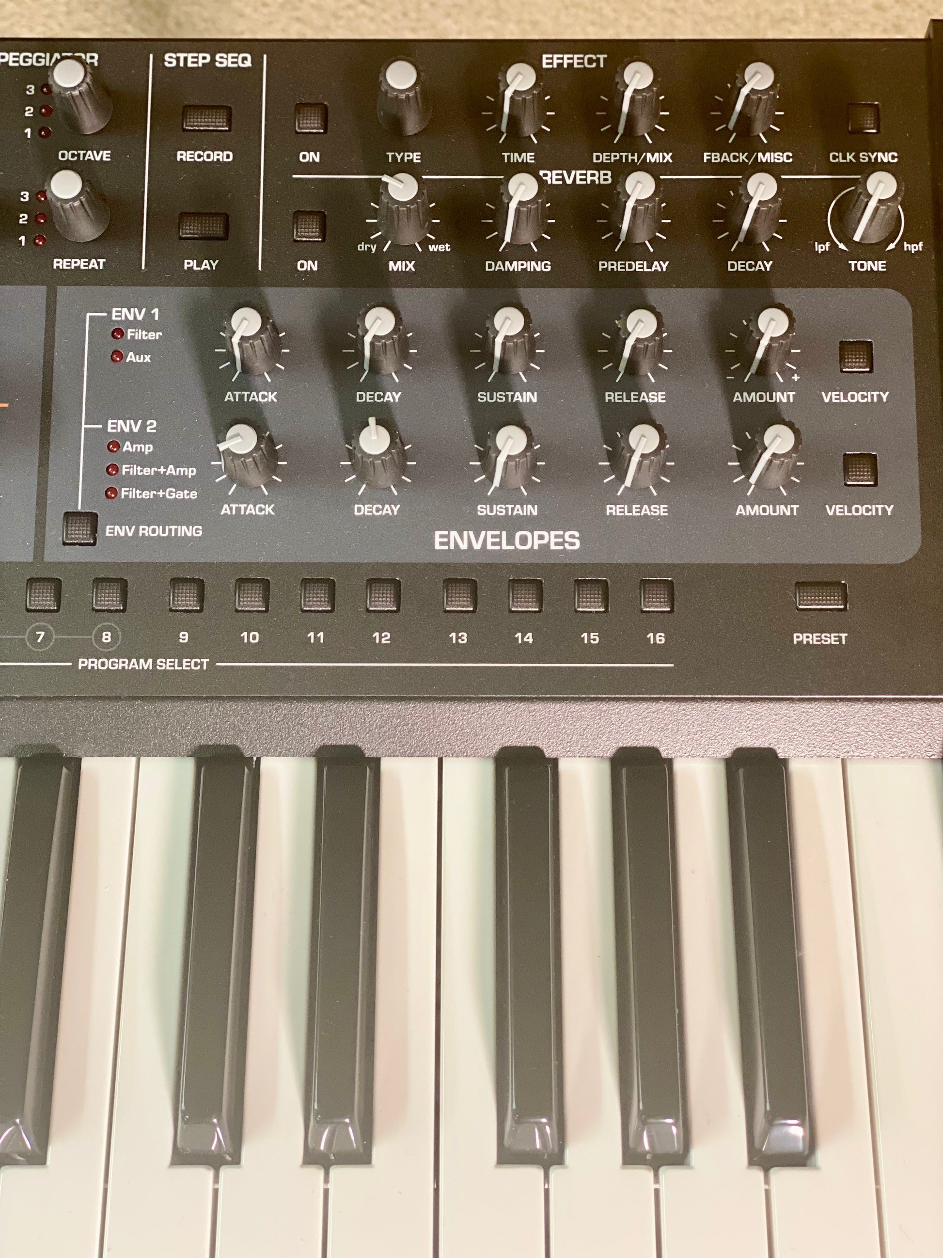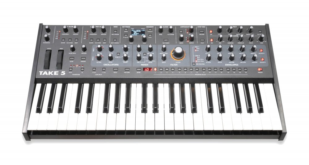 The Take 5 feature set is rounded out with two LFOs (1 global, and 1 per-voice LFO), ADSR+delay envelopes, dual digital effects (a dedicated reverb and a suite of time-delay and other effects) a separate additional overdrive effect, and extensive modulation possibilities. A 64-step polyphonic sequencer and multimode arpeggiator complete the picture.