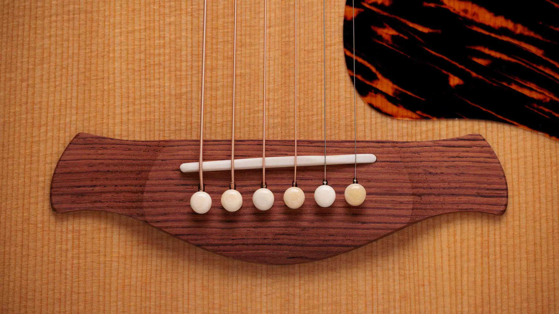 Appointments include a Curve Wing bridge in Honduran rosewood with matching bridge pins, cream-coloured binding and a matching single-ring rosette, Crest inlays, newly modified headstock shape, a firestripe pickguard, and a full-body gloss finish. It ships with LR Baggs Element VTC electronics and a deluxe hardshell case with a British Cocoa exterior.